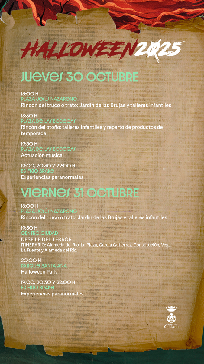 Así, el día 30 arrancará a las 18.00 horas en la Plaza Jesús Nazareno con el ‘Rincón del truco o trato’, que contará con el Jardín de las Brujas y talleres infantiles. Asimismo, a las 18.30 horas dará comienzo en la Plaza de las Bodegas el ‘Rincón del otoño’, con talleres infantiles y el reparto de productos de temporada. Y a las 19.30 horas en esta misma ubicación habrá una actuación musical. Además, el Edificio Brake acogerá a las 19.00, 20.30 y 22.00 horas experiencias paranormales.